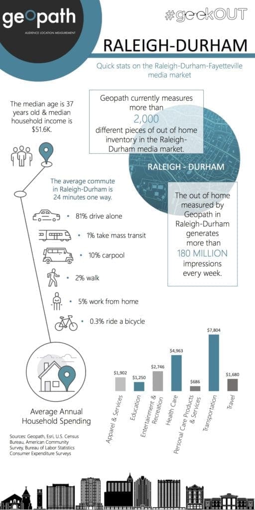 This week’s Geopath Market Spotlight focuses on the Raleigh DMA. Infographics for the top DMAs and much more are available to Geopath members in their geekOUT Library. For more information on how to become a Geopath member, you can visit: http://geopath.org/membership/.