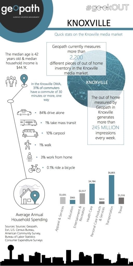 This week’s Geopath Market Spotlight focuses on the Knoxville DMA. Infographics for the top DMAs and much more are available to Geopath members in their geekOUT Library. For more information on how to become a Geopath member, you can visit: http://geopath.org/membership/.