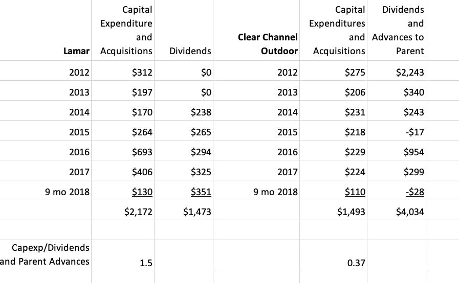 Insider expects Clear Channel Outdoor will cut ties with iHeart Media and leave bankruptcy during 2019. The reorganization plan has been approved by creditors and is waiting final Court approval. This will be a great thing. Since 2012 Clear Channel Outdoor has been hamstrung by high leverage and a parent which would rather grab cash than grow the business. Look at this chart. Since 2012 Clear Channel Outdoor has spent only $0.4 on capexp for every dollar of dividends and parent advances. Since 2012 Lamar has spent $1.5 on capexp for every dollar of dividends. Lamar invests in the future. Clear Channel Outdoor’s parent strips the cupboard. Freedom from iHeart gives Clear Channel Outdoor the ability to invest in the future.