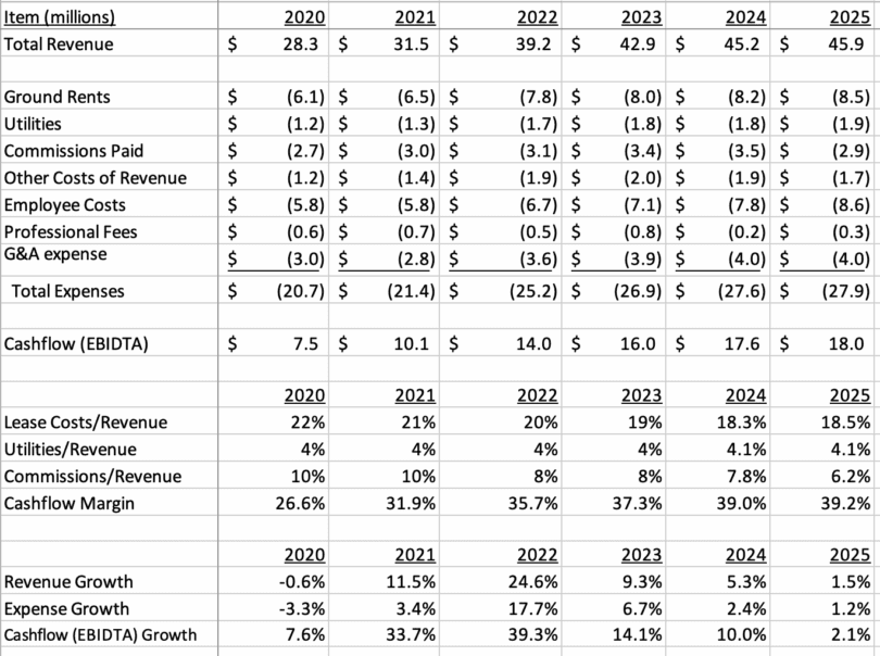Link Media keeps close control over expenses. Revenues have grown faster than expenses for 6 consecutive years, which has resulted in an expansion in the cash flow margin from 26.6% in 2020 to 39.2% in 2025. Another similarity to Lamar.