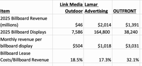 Link Media’s billboard plant looks more like Lamar than OUTFRONT. It is mostly roadside billboards in suburban and rural areas. Link media’s lease costs are low and it’s revenue per face is also closer to Lamar’s than to Outfront.
