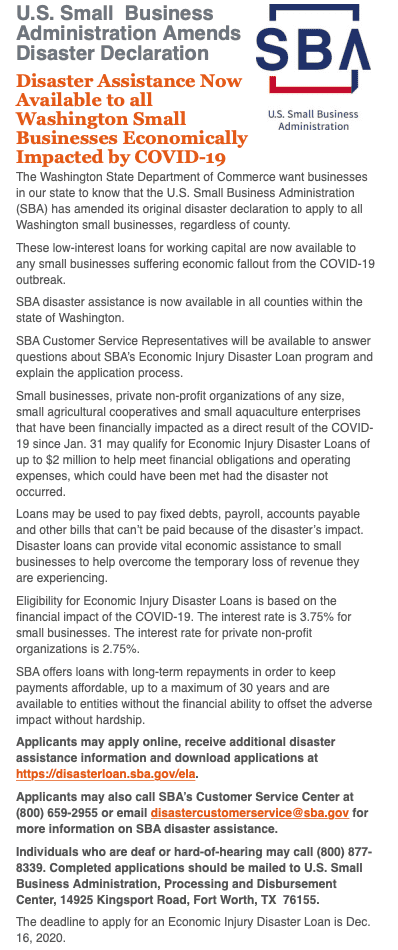 - Document revenue losses caused by coronavirus in case you want to seek working capital disaster financing from the SBA. Here’s a link to the SBA disaster loan assistance page which highlights eligible disaster areas and allows you to apply online. Looks to Insider like most states are eligible for financing. Insider received this notice from the SBA earlier this week.