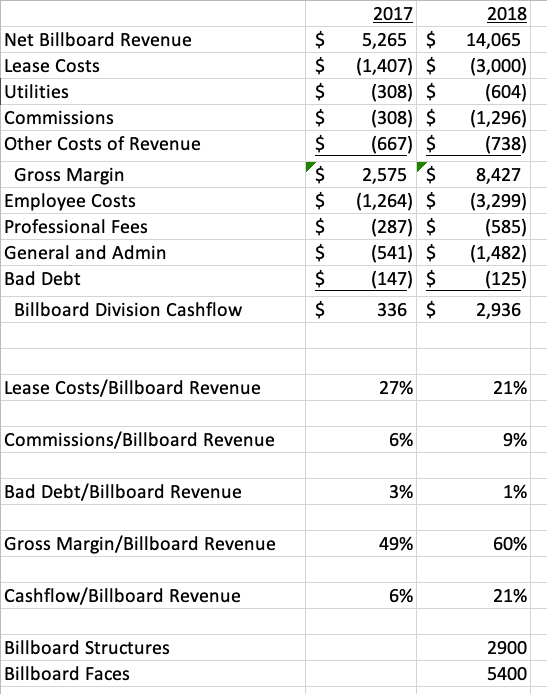 Link Media Matures. Link Media Outdoor has moved from startup stage to mature company stage. Lease costs are down from 27% in 2017 to the 20% industry norm due to increased revenues. The company’s cashflow margin improved from 6% in 2017 to 21% in 2018. Here are Link Media Outdoor’s numbers.