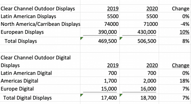 Clear Channel Americas (i.e. North America and Caribbean) displays declined 4% in 2020. Each of the Big 3 out of home companies pruned poor performing locations. European displays increased. Insider suspects this was due to Clear Channel Outdoors winning European transit bids. And digital displays grew as well. Not surprising because one of the company’s 5 strategic initiatives is the “continued digitization of our portfolio.”