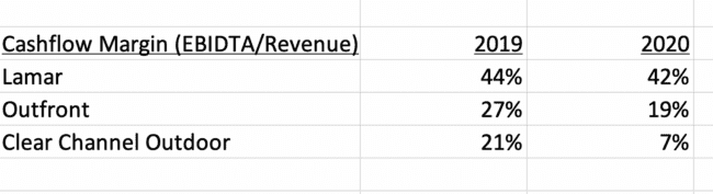 Clear Channel Outdoor had the lowest margin of the big three US public out of home companies going into covid and has the lowest margin exiting covid. Makes sense that Clear Channel Outdoor CFO Brian Coleman is talking about additional expense cuts in 2021.