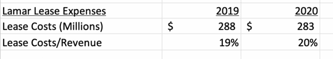 Lease expenses ended 2020 at 20% of billboard revenue, up slightly from 19% of revenue during 2019. Lamar has the lowest lease costs of any of the big three. Buying all those easements helps.