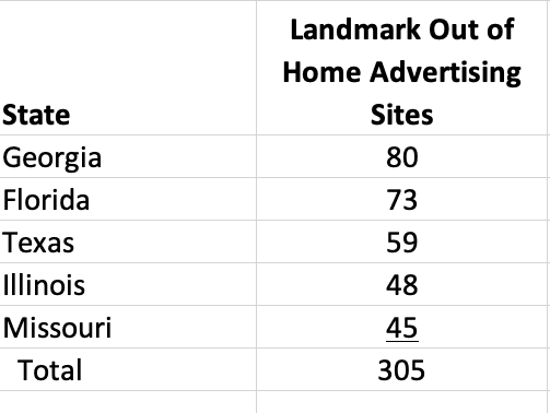 Insider has heard that Landmark is not interested in a lease unless the monthly rent is greater than $300/month. The underwriting and documentation costs don’t justify the investment for small leases. 80% of Landmark’s out of home leases are in top 100 BTA markets. The average revenue for a Landmark out of home lease is $1,527/month which suggests a focus on larger markets.