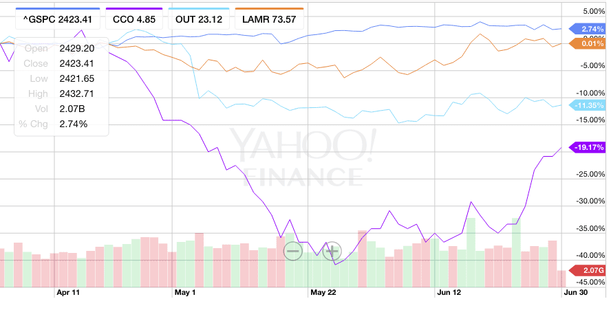 Lamar, Outfront and Clear Channel Outdoor stock return for 3 months ended June 2017