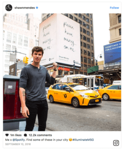 This external social promotion is completely organic, free of charge. Consider for a moment that Kim Kardashian can get up to $250,000 for a single post, and Chrissy Teigen – a more efficient option – can charge $40,000. However, celebrities who manage and orchestrate their own brand are sharing selfies in front of their billboards all at no extra charge! When you take into account celebrities like Kim Kardashian can have over 100 million social followers, the power behind this kind of organic promotion is abundantly clear.