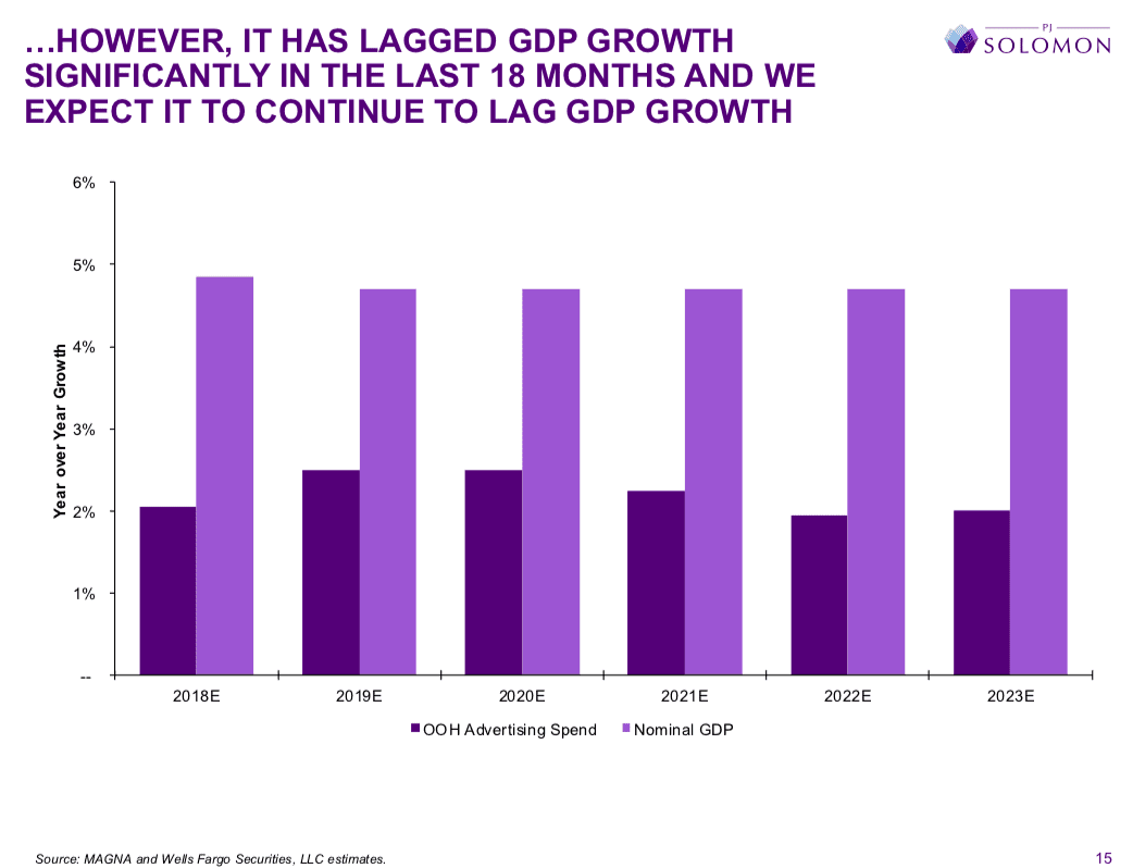 Slowing growth. Out of home has traditionally been a GDP business. A 1% rise in GDP means a 1% rise in revenue. This may no longer be the case. The out of home industry has grown at only half the rate of GDP over the past 18 months. Magna and Wells Fargo Securities project out of home revenues will grow at half the rate of GDP over the next six years.