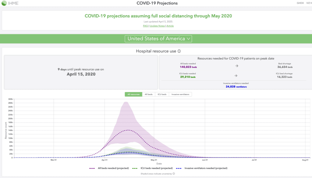 The US is 9 days away from peak hospital covid-19 use as you can see below. Looks like social distancing will be needed through sometime in May.