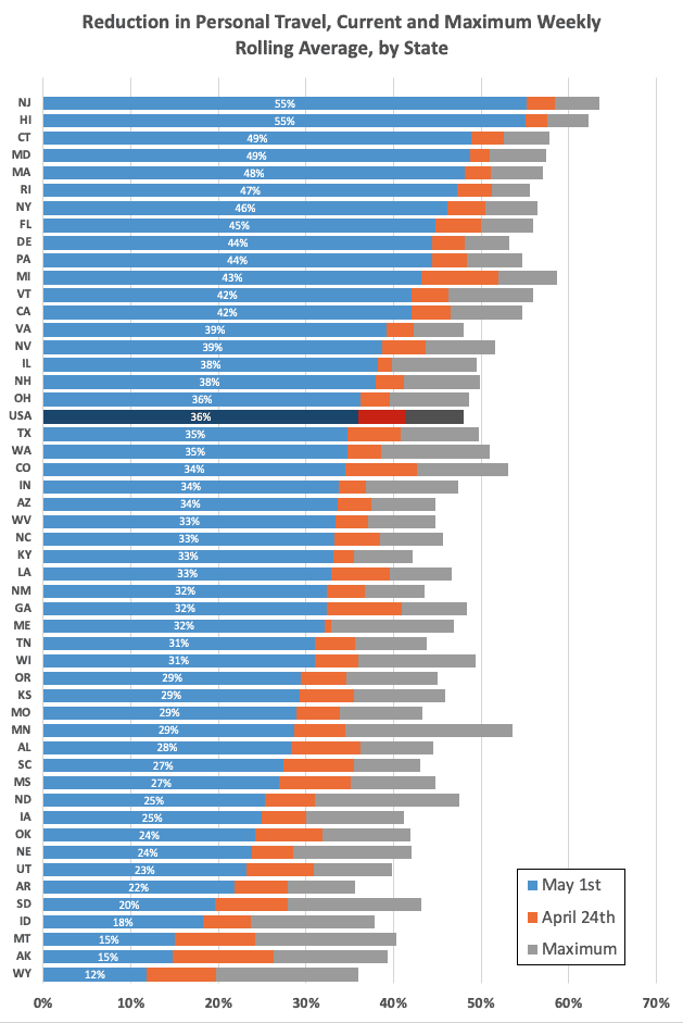 - Passenger travel improved to 64% of normal for the week ended May 1 up from 59% of normal for the week ended April 24. Travel is compared to a control period in February before traffic began to decline.