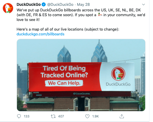 Duck Duck Go is running a campaign on 2,245 billboards in the US and 2,261 billboards in Europe. The campaign highlights the fact that DuckDuckGo gives users better privacy. Click on the map below to see where the boards are located.