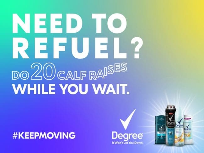 The digital ads are strategically placed nationwide around gas stations, grocery stores, and charging stations, disrupting mundane, everyday moments and turning them into fun, unexpected reminders to stay active and keep moving. With a Gallup poll reporting that 38% of Americans are getting less exercise than before the pandemic, Degree wanted to identify quick, creative ways for people to incorporate movement into their daily lives that don’t feel like an added task or stressor. The out-of-home rollout supports Degree’s larger #KeepMoving campaign this year to inspire confidence in everyone to move more, including a partnership with NBA superstar Kevin Durant.