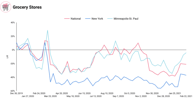 Of course, these reactions varied by DMA. New Yorkers stocked up earlier, with movement around OOH at grocery stores increasing to 41.5% above pre-COVID levels the week of March 9th. Minnesotans went to the grocery store in increased numbers the week of March 16th, with movement around grocery store OOH media 45.8% above pre-COVID levels.