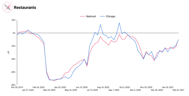 Popular summer destinations included restaurants—since people could enjoy outdoor dining in many DMAs. In Chicago, people embraced the outdoor dining scene, leading to increased movement around OOH media at restaurants. During some weeks, foot traffic even increased above pre-COVID levels at restaurants in Chicago. For example, the week of August 3rd, movement reached 13.0% above pre-COVID levels.