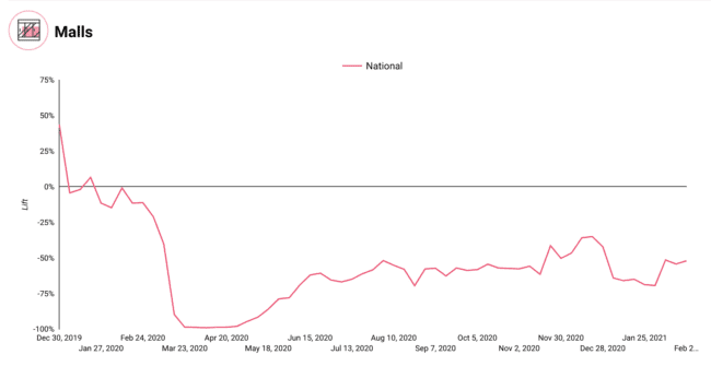 With the vaccine rollout underway, foot traffic will continue to fluctuate across the board. Retailers and pharmacies offering the vaccine may see impacts to their movement levels. As the vaccine rollout continues and more people are able to safely go about their daily activities, movement around OOH advertising for other categories, like restaurants, malls, salons and more, will also increase.