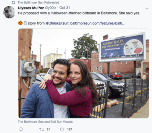A Baltimore man used a billboard to make a marriage proposal. He popped the question in front of a billboard which said “Allison Haley, will you marry me? – Juan Carlos Puga.” Puga rented the Clear Channel Outdoor poster for $500.