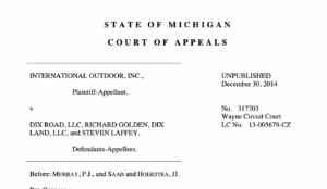 - In 2011 a District Court ruled that the termination of the billboard lease was proper. On appeal a Michigan Circuit Court affirmed the lower court ruling even though the sales transaction between Dix Road and Dix Land was “a little fishy.” The State of Michigan Court of Appeals confirmed the ruling.