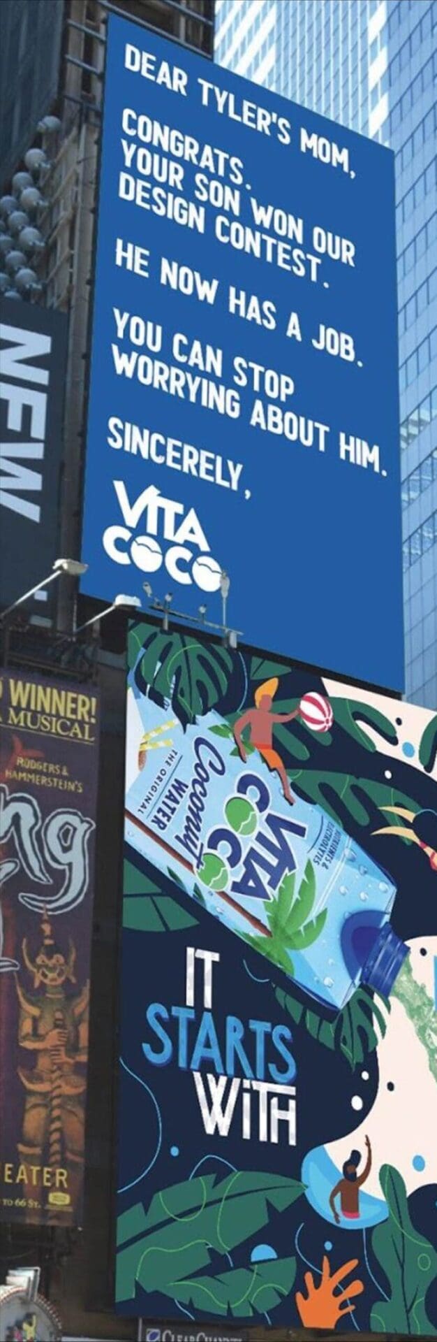 In September Vita Coco launched a billboard contest to let recent graduates and aspiring designers compete to design a billboard. The winning designer was awarded a job as a junior designer with Vita Coco. The company had some fun with the award while running the award announcement in Times Square.