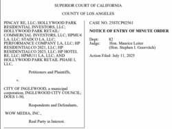 In July 2025 Los Angeles County Superior Court dismissed a preliminary injunction arguing: “Hollywood Park has not shown that irreparable harm will occur to it if the preliminary injunction is denied…Hollywood Park does not identify any deal or contract placed in an eminent risk from the billboard agreement. While Hollywood Parks declarants state that existing relationships with sponsors, advertisers and events “may be negatively impacted”, none of the declarations come from an actual sponsor her site a specific deal that is threatened by the Billboard Agreement.” The case is headed for trial.
