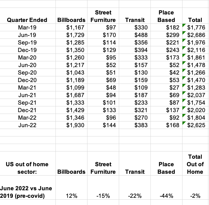 US Billboards have completely recovered from covid and then some. The other US out of home sectors still lag. Here’s what Billboard Insider found after reviewing the last three years of quarterly US out of home revenues by sector as reported to the OAAA.