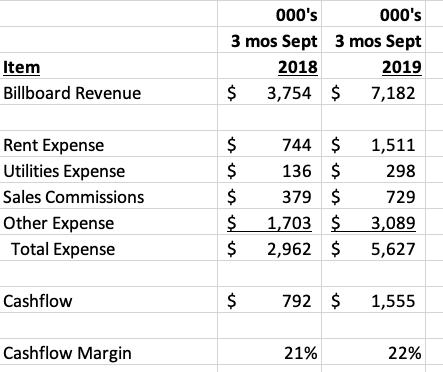 - Billboard revenues increased by 91% to $7.2 million for the three months ended September 30, 2019 due to the impact of acquisitions as well as increases in rental and occupancy rates.