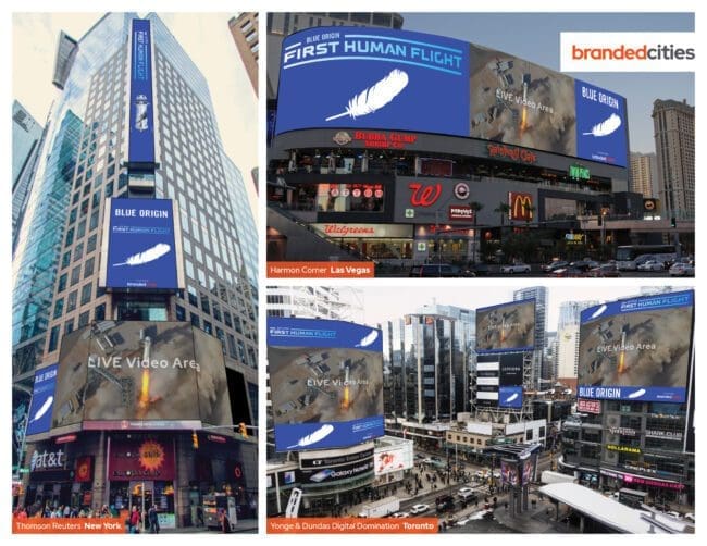 Branded Cities will be livestreaming the launch through some of its most iconic and widely viewed digital spectaculars, including New York’s Thomson Reuters digital spectacular, Las Vegas’ Harmon Corner digital spectacular and Toronto’s Yonge-Dundas at Eaton Centre, 10 Dundas and Atrium on Bay large-format digital spectaculars. Branded Cities’ prominent locations will enable Blue Origin to share this historic moment directly with key markets in North America through a live video feed.