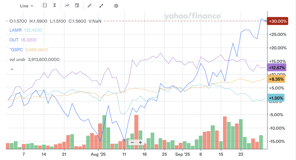Clear Channel Outdoor (blue), OUTFRONT (purple), Lamar (green) and S&P 500 (orange) stock performance for 3 months ended September 30, 2025