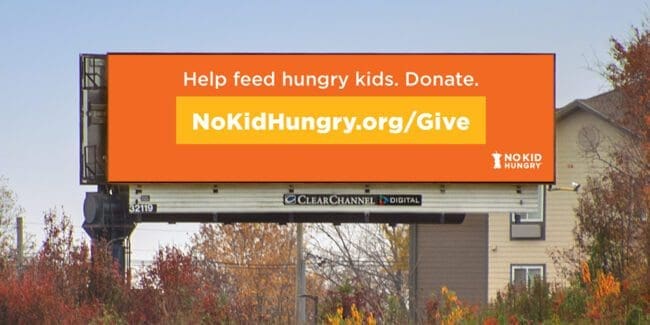 New York, New York – Clear Channel Outdoor Americas (CCOA) (NYSE: CCO) today announced it will partner with No Kid Hungry to launch a nationwide digital billboard campaign to help connect kids to the food they need this holiday season. Promoting resources from No Kid Hungry, a national campaign to end childhood hunger in America, the digital billboard campaign informs communities how they can support children who are hungry and directs those in need to free, healthy meals in their local community.