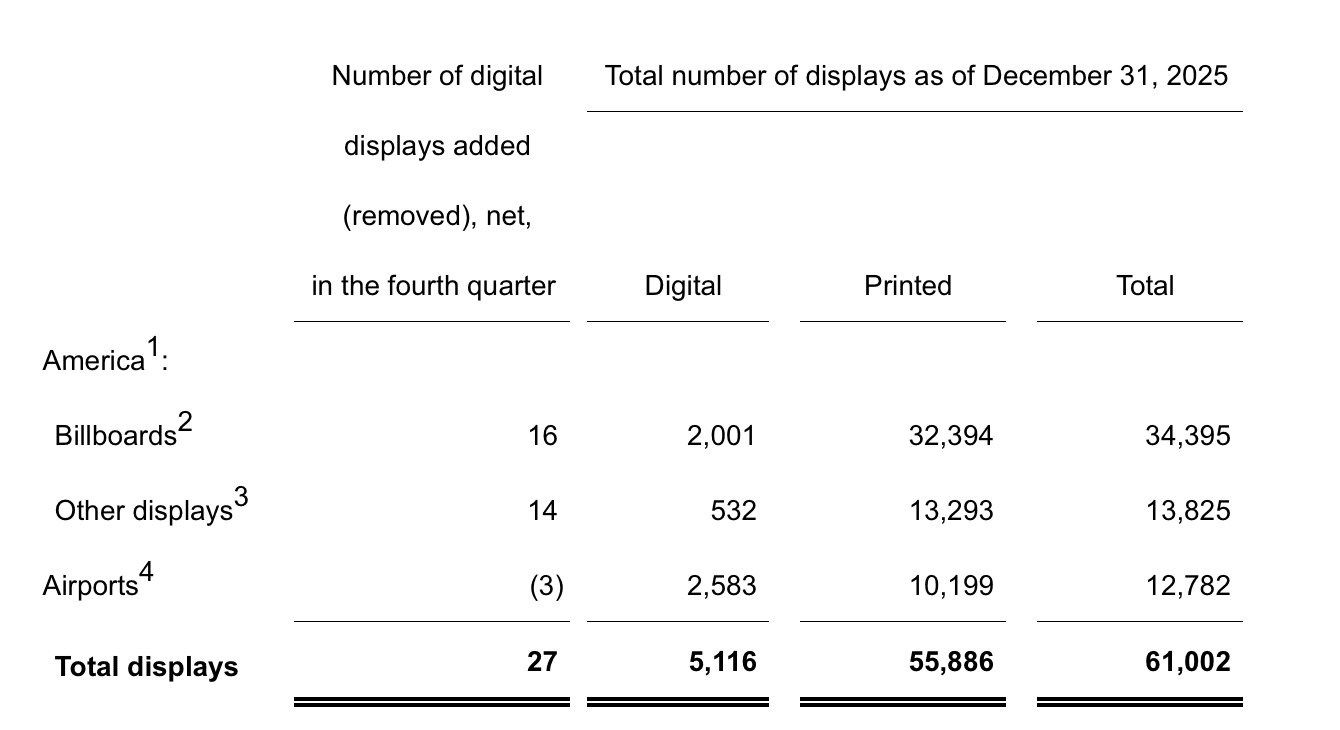 - Capital expenditures totaled 22 million in the fourth quarter of 2025. Clear Channel Outdoor added 16 new billboard displays and 14 new street furniture displays during the fourth quarter of 2025. Here’s a listing of total Clear Channel Outdoor America displays at December 31, 2025: