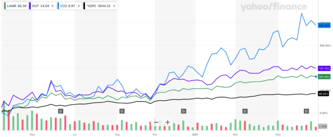 US out of home stocks beat the market during the second quarter of 2021. Clear Channel Outdoor increased by 40% during the second quarter of 2021 versus a 7% increase for the Standard and Poor 500. Clear Channel stock is more volatile than the other out of home companies because it has more debt and financial risk. It goes up the most on good news and down the most on bad news. Maybe the stock market expects that Clear Channel’s sales are on the mend after taking longer to recover from covid than Lamar or OUTFRONT.