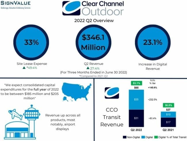 SignValue has prepared this summary of Clear Channel Outdoor’s second quarter 2022 financials. Reach out to one of their consultants for a confidential consultation at (480) 657-8400 or info@signvalue.com.