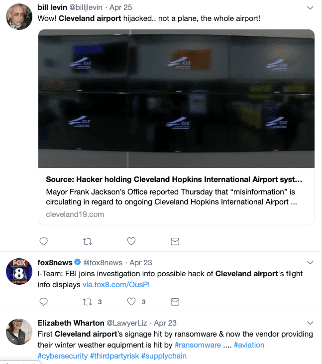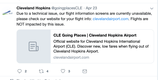 Digital security is important. Cleveland.com and 16:9 report that the Cleveland airport’s flight and baggage information screens were down for much of last week as a result of a malware attack. The FBI is involved. There’s quite a twitter trail.