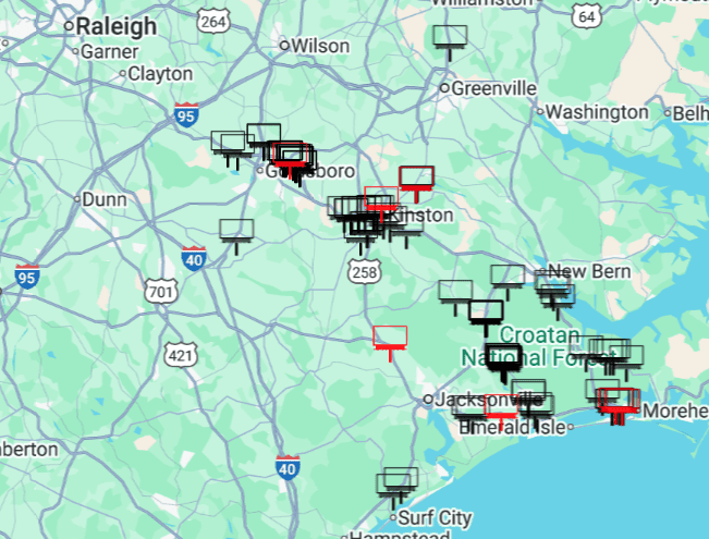 Eastern Outdoor Development, Inc. is a full-service outdoor advertising company offering printed and digital billboards throughout Eastern North Carolina. Their footprint covers east of Interstate 95 all the way to the Crystal Coast. This includes the markets of Goldsboro, Kinston, New Bern, Jacksonville, and Morehead City. Their inventory includes 86 static billboard structures, 9 digital structures, and over 265 advertising displays.