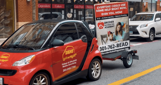 Signs on the move operates a mobile billboard fleet in Washington DC. The company is owned by Steven Galkin and Brett Diamond. The company uses Smart Cars which tow a 5 foot high 3 sided billboard. Jeffrey Snyder is the company’s SVP Sales and Marketing.