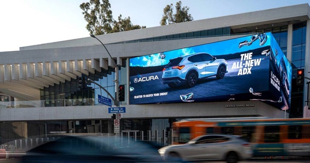 BROOKINGS, S.D. – July 21, 2025 – A new multi-display digital billboard for The Now and Orange Barrel Media (OBM) has been activated at the busiest intersection on Sunset Boulevard in West Hollywood, California, manufactured and installed by Daktronics (NASDAQ-DAKT) of Brookings, South Dakota. Going live in April of 2025, the cube-like LED video project features a total of 2,500 square feet and is the first and only 3D anamorphic display on The Strip.