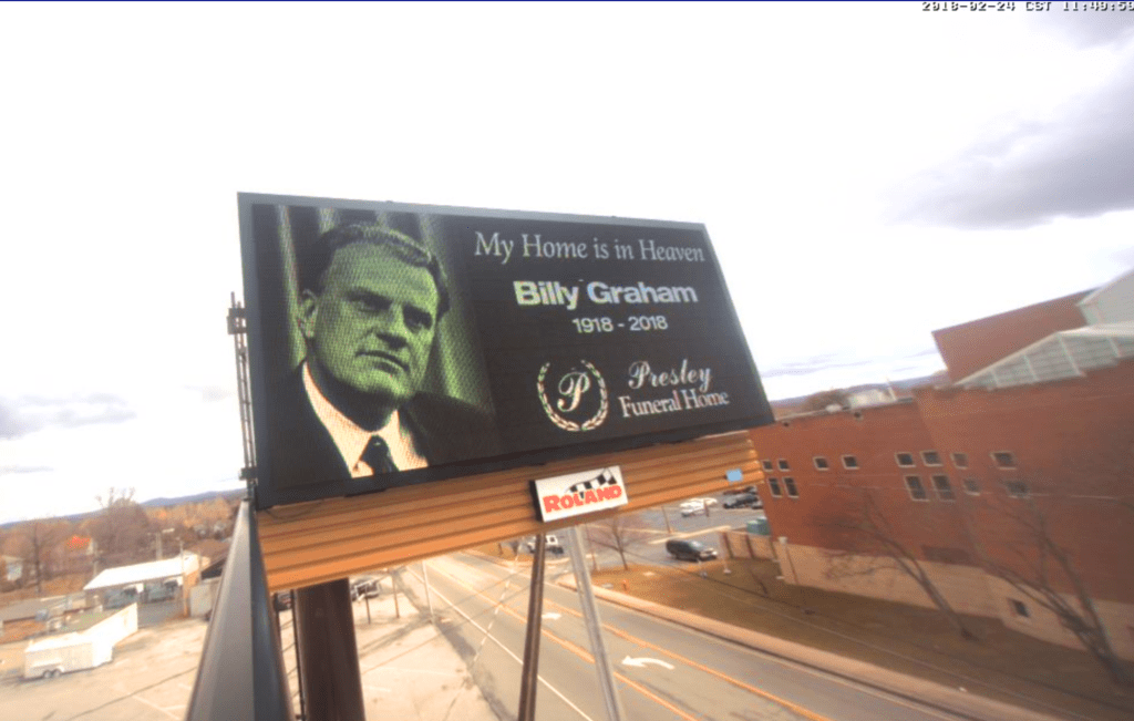 In the days after Billy Graham’s death, 4 of the 30 digital billboards owned by Tennesee-based out of home advertising company Roland Advertising ran this copy.
