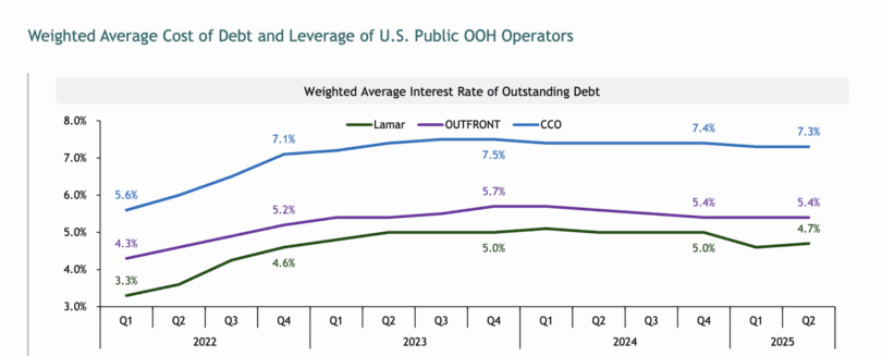 Clear Channel’s debt costs about 200-250 basis points more than OUTFRONT or Lamar due to high leverage.