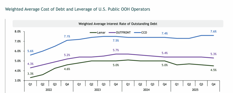 In the past year you can see that debt costs have risen slightly at Clear Channel Outdoor and have declined at Outfront and Lamar.