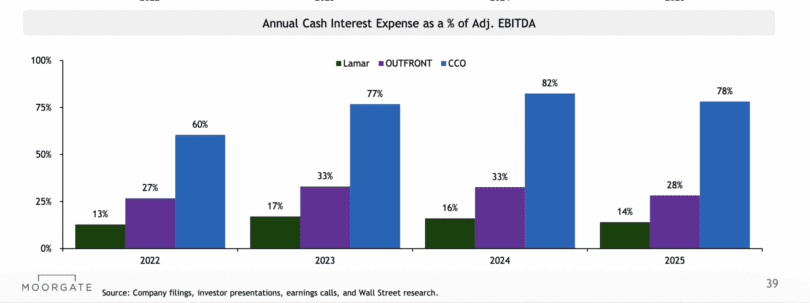 Clear Channel Outdoor has not been spending much on digital conversions or acquisitions. This chart shows why. Interest expense accounted for 78% of Clear Channel Outdoor outdoor cash flow in 2025, versus 28% for Outfront and only 14% for Lamar Advertising. The Clear Channel Outdoor sale to Mubadala Partners is a positive development. It will drop Clear Channel Outdoor’s debt to cash flow and interest expense almost in half, which will free up more cash for capital expenditures and acquisitions.