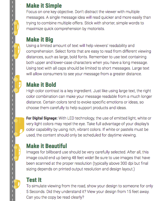 This week’s billboard design tips come from Veale Outdoor Advertising. Insider loves alliteration: Big, bold and beautiful!
