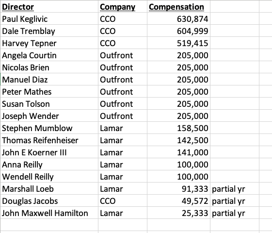 Looks to Insider like there’s an inverse correlation between directors pay and outdoor company long term stock performance. Lamar stock is up 63% over the past 5 years, Outfront stock is down 27% over the past five years and Clear Channel Outdoor stock is down 35% over the past five years. In this case you don’t get what you pay for.