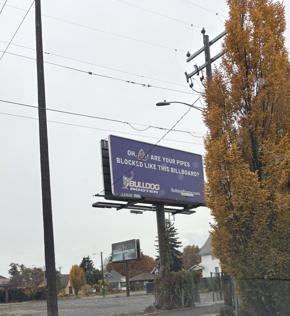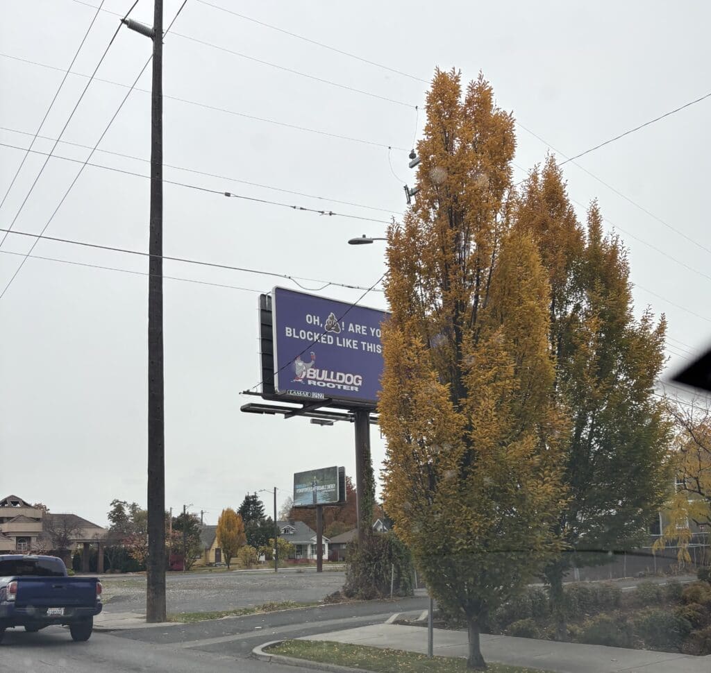 My wife Julie calls me a Billboard Nerd (I confess I am), but even though she is not “in the business”, she has been around long enough to know what interests me. She was driving up to a corner in north Spokane, and noticed this sign, partially blocked by a tree. Yes, that is an evergreen, so it is a year round blockage.