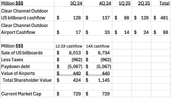 At a 12.5 times sale multiple Clear Channel Outdoor could pay taxes, retire all debt and have a debt free airports division with $68 million of cashflow which is probably worth $440 million at a 5 times cashflow multiple.