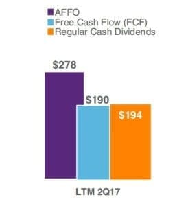 OUT’s 12-month trailing AFFO was $278 million, and dividend payout ratio was 70%, relative to the 67% in Q1-17. The increase is primarily due to higher maintenance CapEx and higher taxes. A payout ratio of around 70% is still right within the zone established when ONE went public and set its original dividend level.