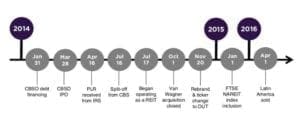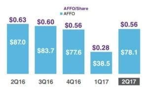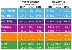 In Q2-17, OUT reported revenues for the quarter were up 2.8%, and organic revenues were up 2.9%. Adjusted OIBDA was down just under 1%, a significant improvement from Q1-17. Despite the slight drop in OIBDA, AFFO was down 10% in the quarter due to higher maintenance CapEx and higher cash taxes.