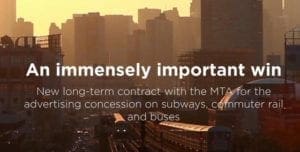 The reader was referring to New York OUT’s long-term deal with New York Metropolitan Transportation Authority (or MTA), the largest public transit authority in the country. The deal from the MTA gives OUT the ad and communications concessions for subway, commuter rail and buses along with billboards.