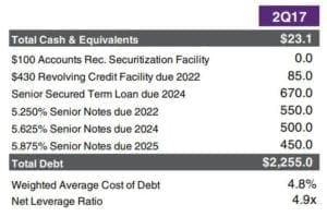 As of the end of Q2-17, OUT’s liquidity position was $466.6 million, including $23.1 million of cash, $343.5 million of availability on the revolving credit facility, and $100 million of availability under a new three-year accounts receivable securitization facility (entered on June 30).