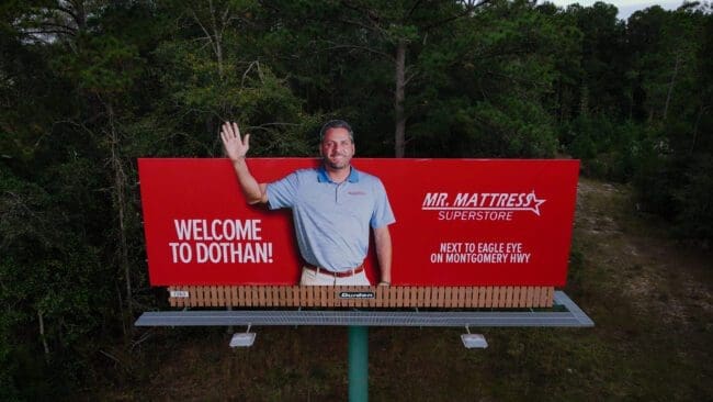 This regional client had always done business with one of our billboard competitors in a market that we shared. So when MR MATTRESS opened a new store in our hometown of Dothan, AL it just so happened that Durden Outdoor had an available 14×48 right over his store. Our sales team knew we had to pitch a knock your sheets off idea to get in the door with them. That’s when the Famous Maker’s creative team dreamed up the idea of the owner Jeffery Douglas holding a huge illuminated inflatable 3D pillow to solidify his position in this new market. During the photo shoot at Durden studios our late sales director Frankie “The Stoneman” Stone upsold Jeffrey an additional board on a main artery coming into town. The client said the only way that I’ll buy the additional board is if you can have me on the board welcoming everyone into town. That is when the waving arm idea was born. Our in-house production team has built 12’ truck doors that open and close, waving insect arms, 3D debt ball and chains, LED throbbing spinal cords, non of which are easy but we do love a challenge. Several brainstorming sessions, 3 motors and two swinging concepts later we figured it out. We were just so thrilled that this client believed in us and our medium to do two HUGE creatives in one campaign…….these opportunities are rare.
